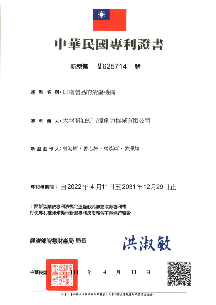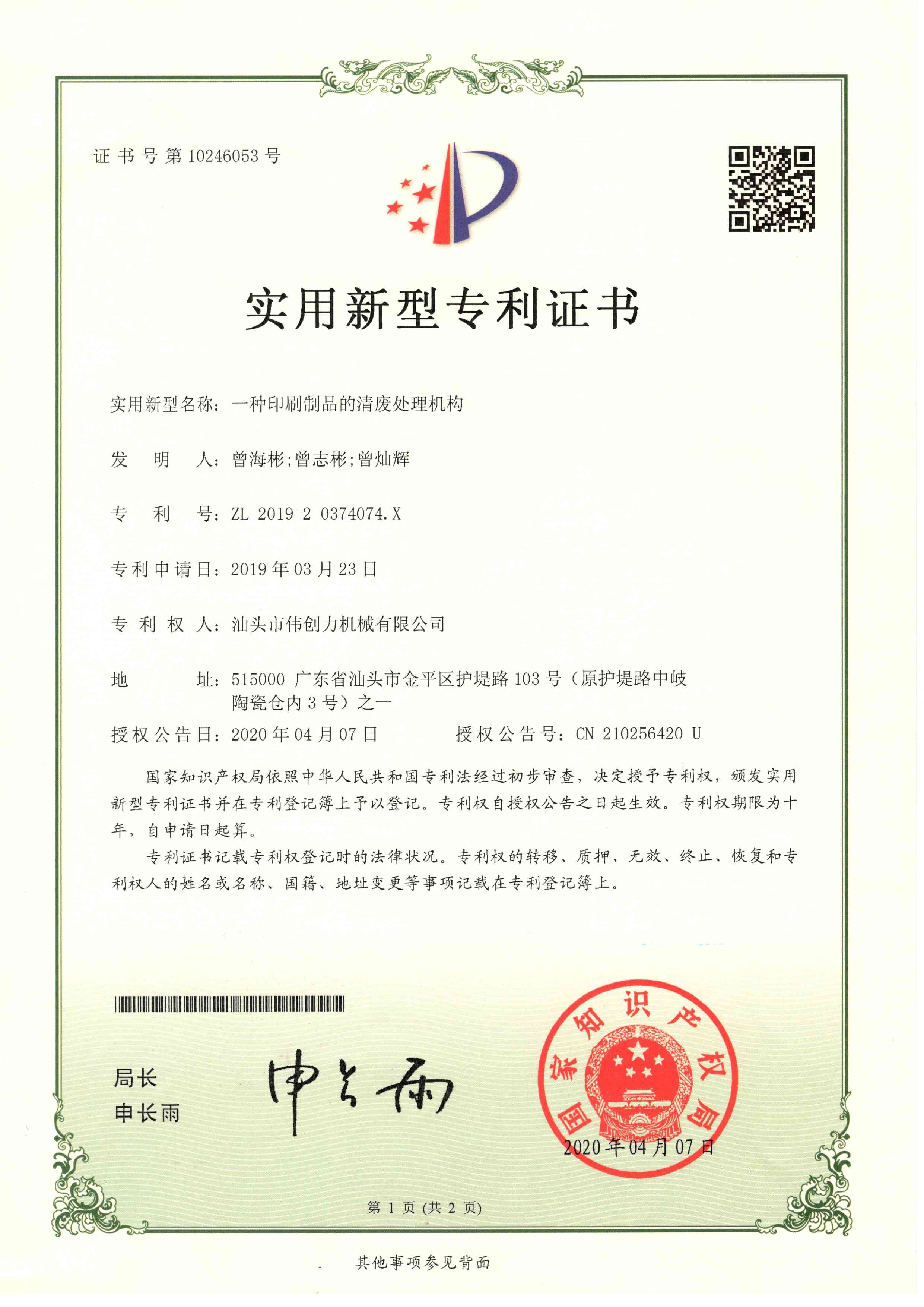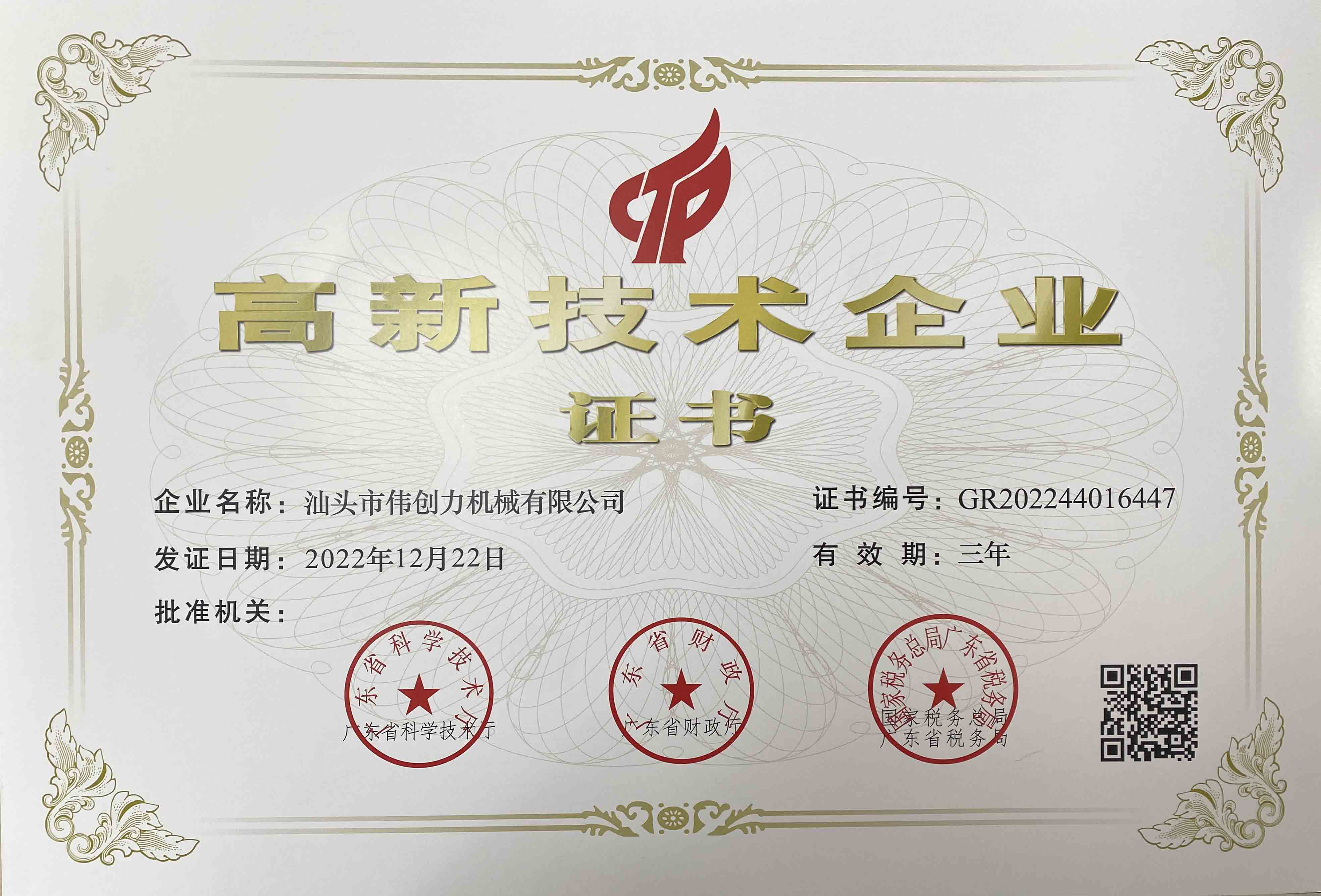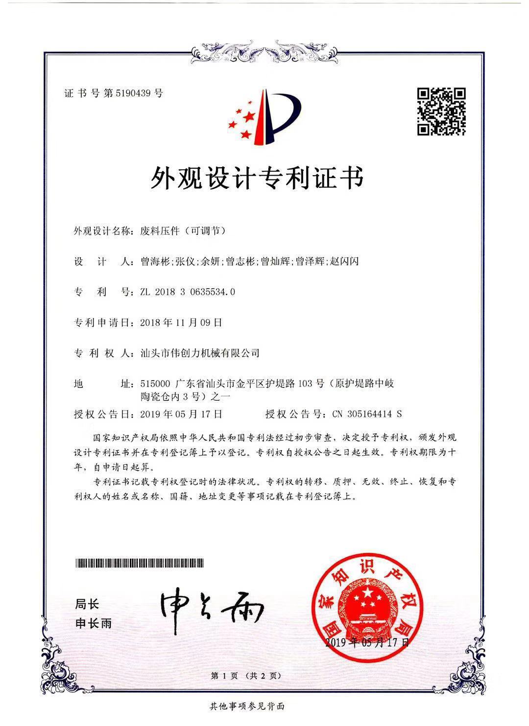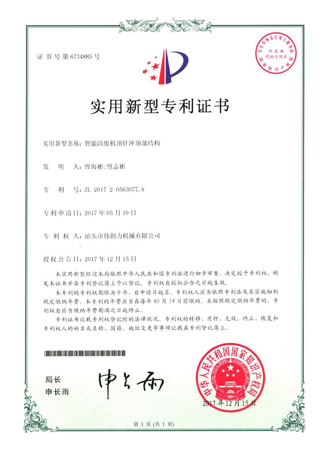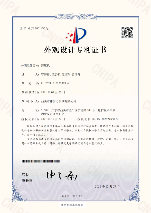 汕頭市偉創(chuàng)力機(jī)械有限公司是一家具有卓越創(chuàng)新能力的國(guó)家高新技術(shù)企業(yè),擁有多項(xiàng)發(fā)明專利、全球多國(guó)專利,公司秉承工匠精神、重信守約的宗旨,竭誠(chéng)為客戶提供專業(yè)、優(yōu)質(zhì)、高效、真誠(chéng)的服務(wù)。汕頭偉創(chuàng)力,清廢機(jī)領(lǐng)域的硬核標(biāo)桿!