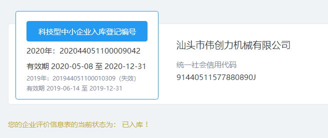 我司汕頭市偉創(chuàng)力機械有限公司被評為2020年全國"科技型中小企業(yè)"