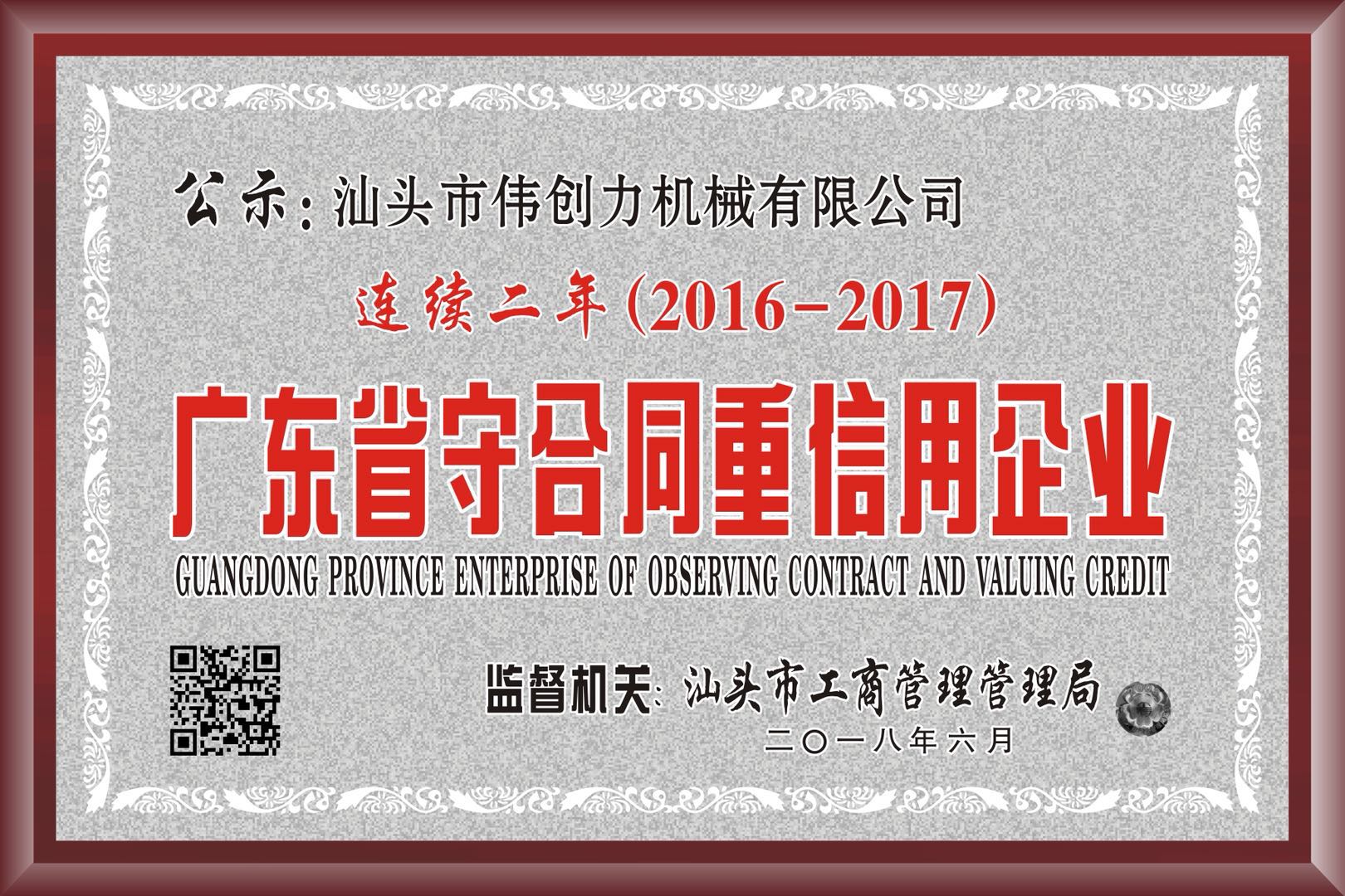 2018年汕頭市偉創(chuàng)力機(jī)械有限公司連續(xù)二年被評(píng)為"守合同重信用企業(yè)"