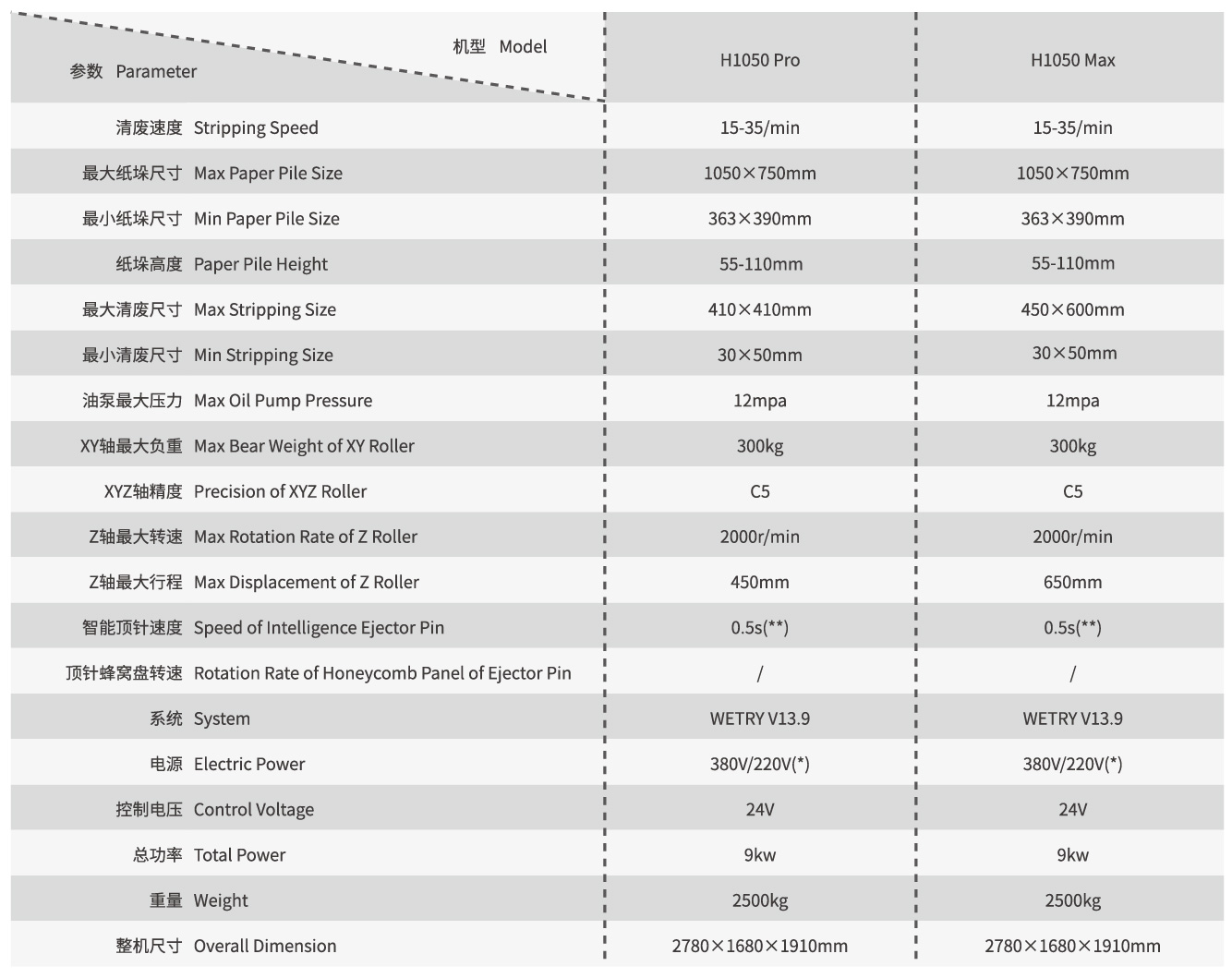 WETRY-H1050 型智能清廢機釆用獨創(chuàng)的發(fā)明專利技術(ZL2015103048859、ZL2016102587813、ZL2016102587404),針對多種不同大小盒形混拼在一起的產(chǎn)品,能單機頭實現(xiàn)一次性自動清廢,大大縮小了X、Y、Z軸的傳動距離,有效地提高了紙垛傳送的精度和清廢速度。對共刀、抽芯的產(chǎn)品無任何要求和限制。