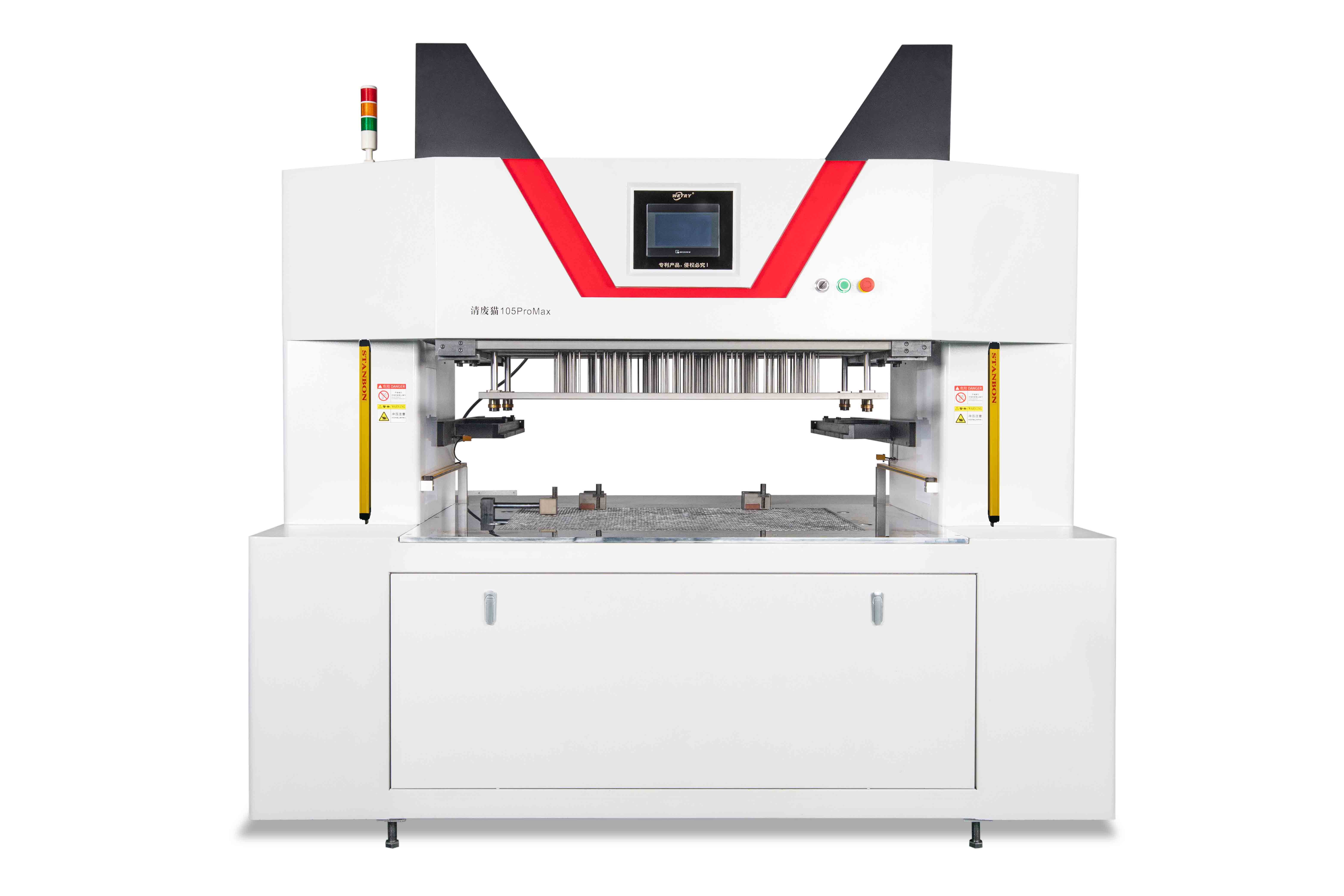 清廢貓105Ultra增加了上模移動,當(dāng)上下模清廢工作完成后,上模自動往后退,方便取品工作,當(dāng)扔掉廢料后上模自動回到原位等待下一次清廢。這種移動方式的好處在于不影響生產(chǎn)效率,相比下模移動可以提高三倍的清廢產(chǎn)量。